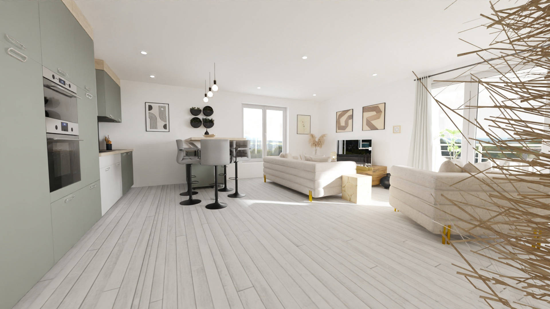 Ces appartements de type 3 sont  fonctionnels et confortables avec deux chambres séparées de leur pièce de vie spacieuse à la cuisine ouverte, offrent des espaces de vie polyvalents et conviviaux.